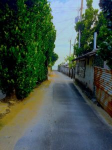- 今帰仁今泊集落の朝、突き当たりには海